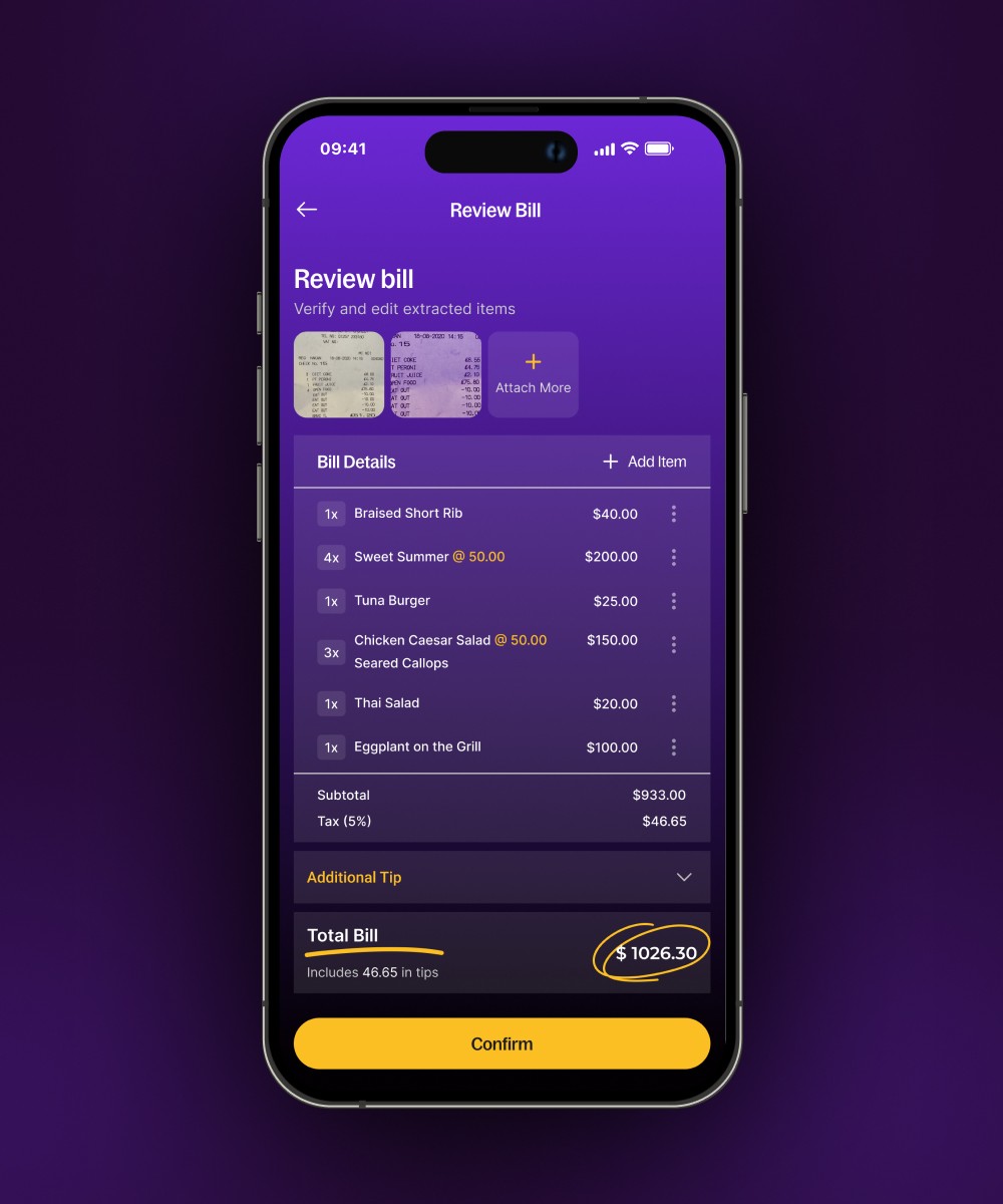 Instantly breaks down the total bill and assigns exact amounts so no one has to calculate, guess, or double-check numbers.
